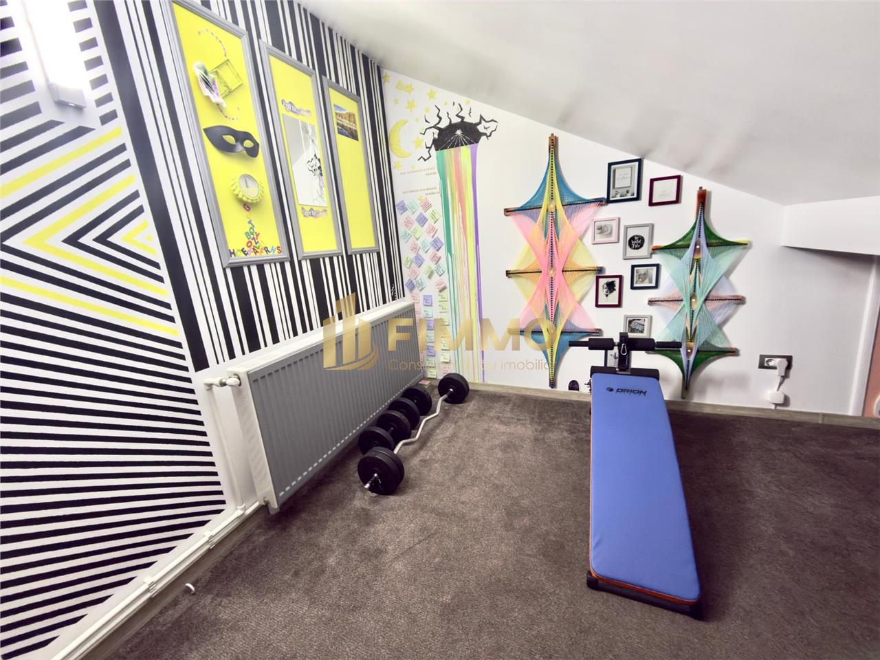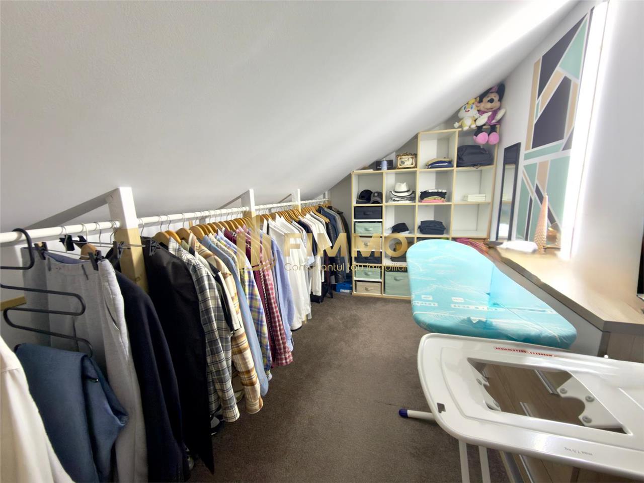Podul mansardat este complet functional si amenajat, fiind dotat cu calorifer, fereastra Velux, izolatie, mocheta, rigips vopsit, prize si intrerupatoare electrice, oferind multiple posibilitati de utilizare. Acesta dispune de zona de dressing, spatiu de birou, zone de depozitare si spatiu liber generos, putand fi transformat cu usurinta in dormitoare suplimentare sau alte spatii de locuit, inaltimea la coama centrala fiind de aproximativ 2,20 m.