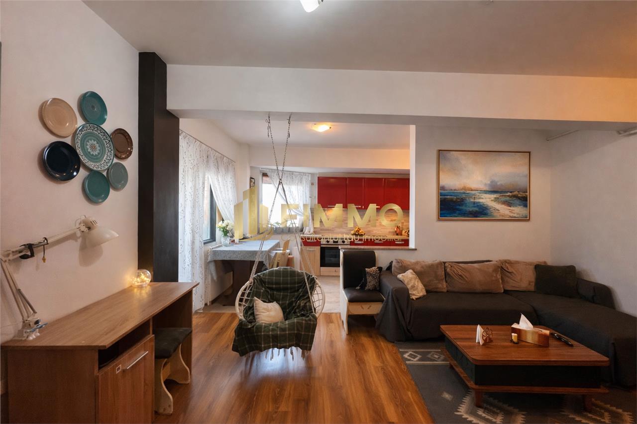Bucataria este complet mobilata si utilata, cu mobilier modern si spatii de lucru bine gandite, integrata armonios in zona de living. Livingul este spatios, cu iluminare naturala buna si o atmosfera calda, potrivita atat pentru timp petrecut in familie, cat si pentru socializare.